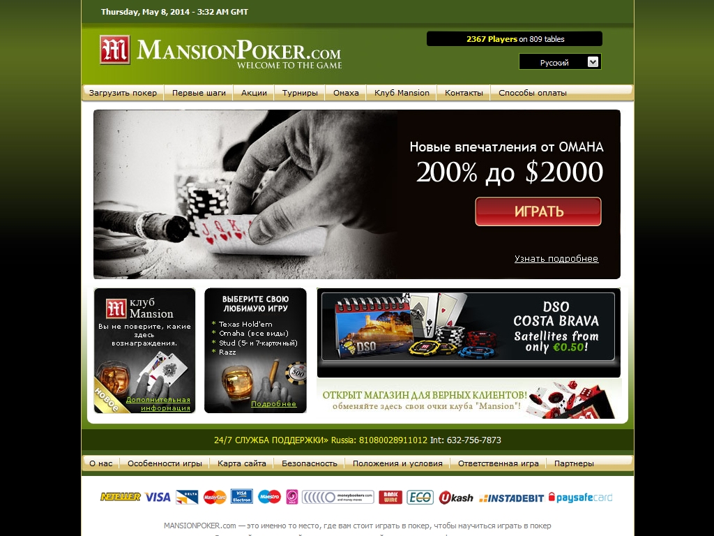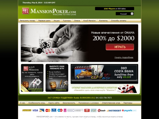 Mansion Poker предоставляет множество способов ввода и вывода денежных средств: Visa, MasterCard, Delta, Visa Elektron, Moneta.ru, Moneybookers, NETELLER, Ukash и другие.