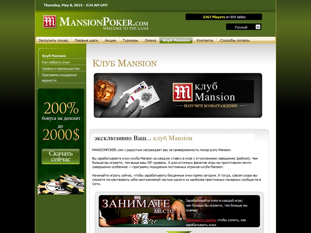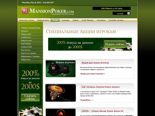 Mansionpoker постоянно проводит многочисленные акции для своих игроков и предлагает участие в клубе Mansion, где все игроки получают эксклюзивные подарки, турнирные билеты и разнообразные призы от покер-рума.