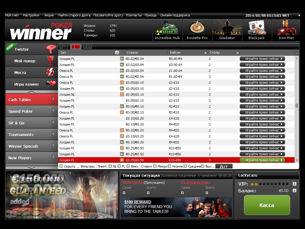 активно развивающийся покер-рум, проводятся многочисленные акции для игроков с призами, подарками, участие в турнирах. Своевременная служба поддержки по всем интересующим вопросам