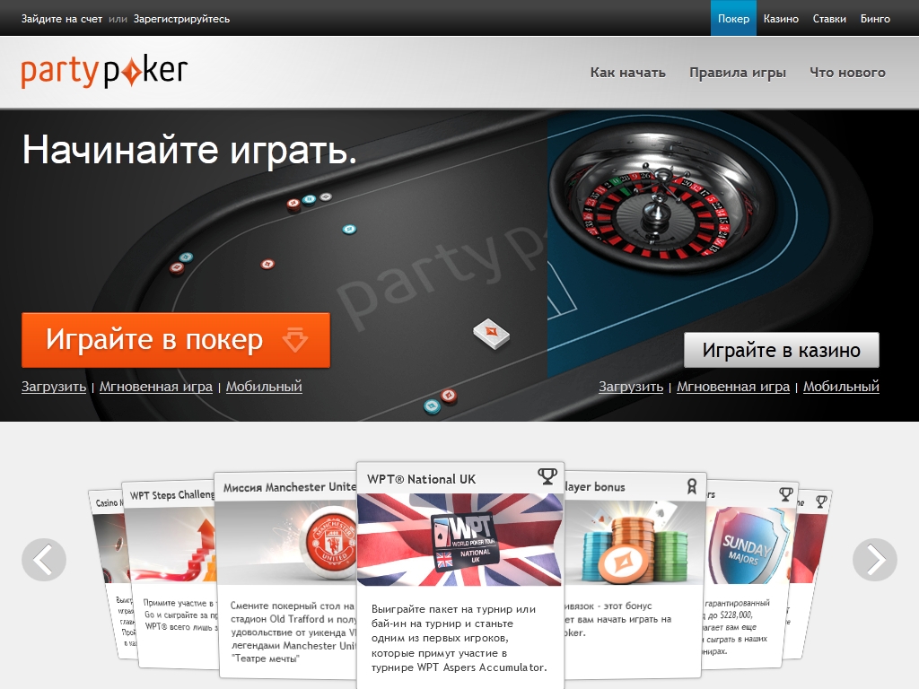 PartyPoker довольно длительное время находиться на плову игорной индустрии, и вызывает доверие своих клиентов!Отличная бонусная политика!Множество различных акций поощряющих своих пользователей!Вод и вывод средств можно осуществлять различными способами!