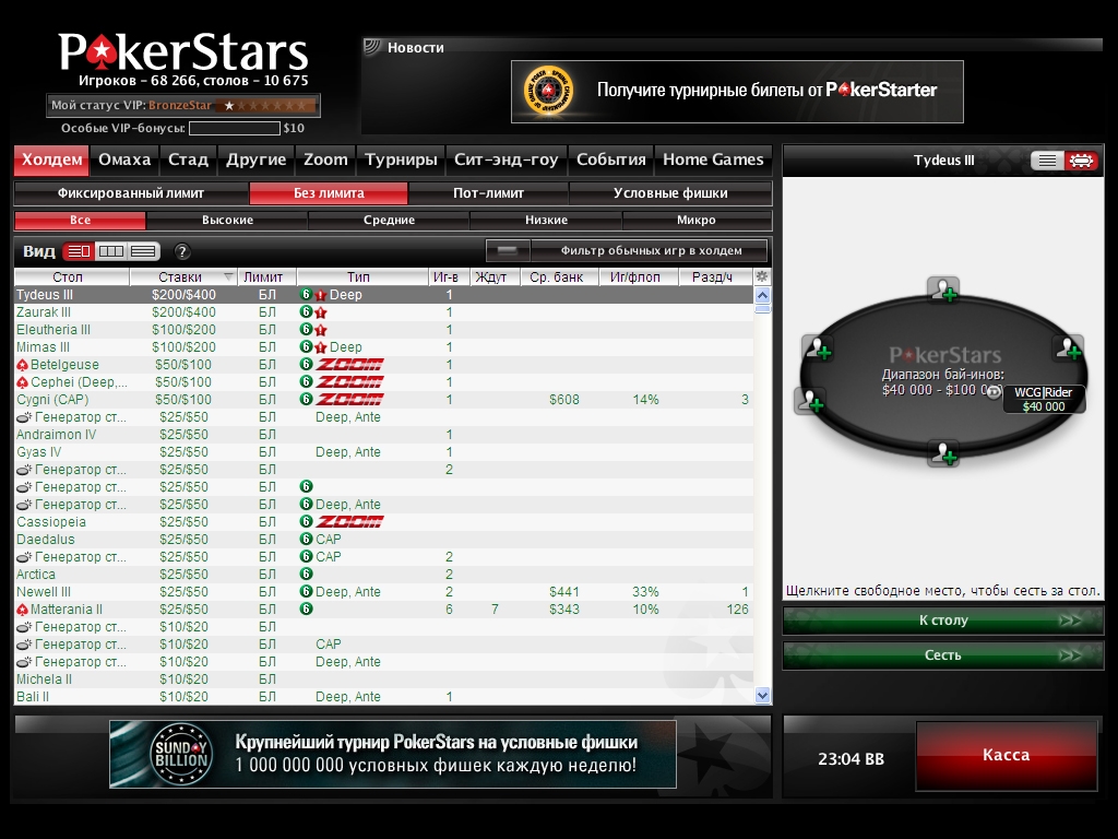 - VIP-турниры и особые VIP-турниры с крупными призовыми фондами (свыше 1000000 долларов)