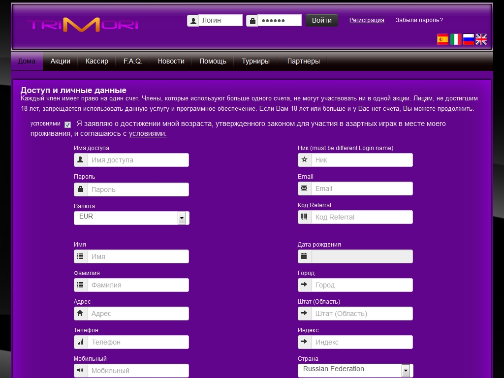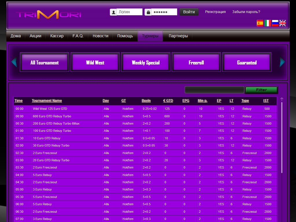 Trimori Poker проводит множество разнообразных турниров, это фрироллы для новых игроков, СНГ-турниры, МТТ-турниры, фризауты и сателлиты.