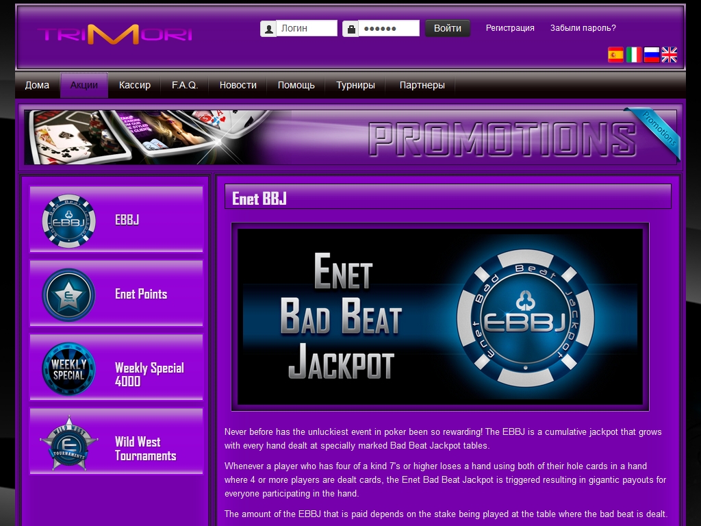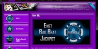 Акция «Enet Bad Beat Jackpot» дает возможность всем игрокам получить крупный денежный приз в том случае, если их сильная комбинация будет бита другой более сильной комбинацией. Джек-пот постоянно растет, и его сумма может превышать 100 000 евро.