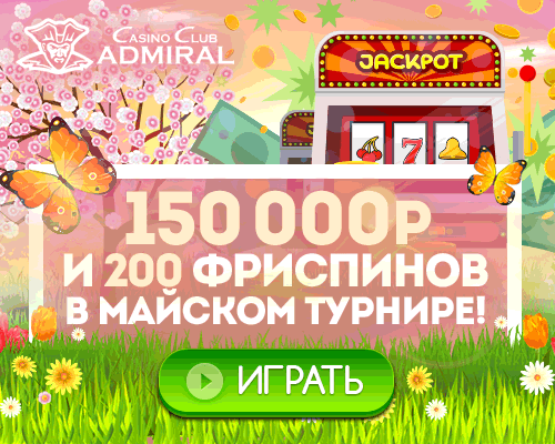 Великолепные новости для всех азартных игроков Адмирала – тут 26 апреля стартует сразу два турнира! «Майский куш» принесет игрокам с депозитной историей до 199 999р. целых 150 000р. и 200FS за наибольшее количество ставок в слотах от 30р. каждая. ![]()