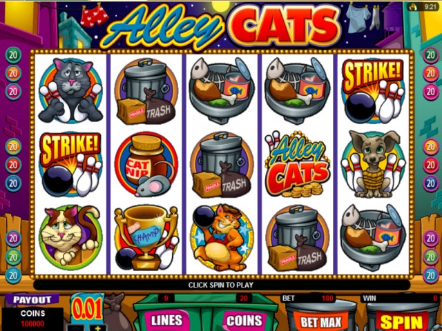 Видео слот представляет собой виртуальную игру на тему тяжелой, но веселой жизни бродячих котов. В видео слоте «Кошки с переулка» присутствуют пять барабанов и предлагают игрокам до 9 выигрышных линий. Для одной игры по линии следует иметь 20 денежных единиц, а в случае 9 линий – нужно 180 денежных единиц.