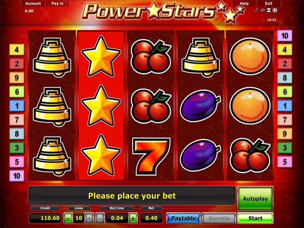 Независимо от многообразия новых игровых автоматов, неизменно пользуются спросом классические слоты, на которых не только развлекаются, но и реально выигрываются деньги. Таким автоматом крупнейшей компании по игровому программному обеспечению Novomatic Gaminator является «Power Stars», в котором использует всем давно известные символы счастливых знаков. Красочная графика и анимация со звуковым сопровождением напоминают нам старые добрые времена, когда игровые заведения не пестрели таким разнообразием.
