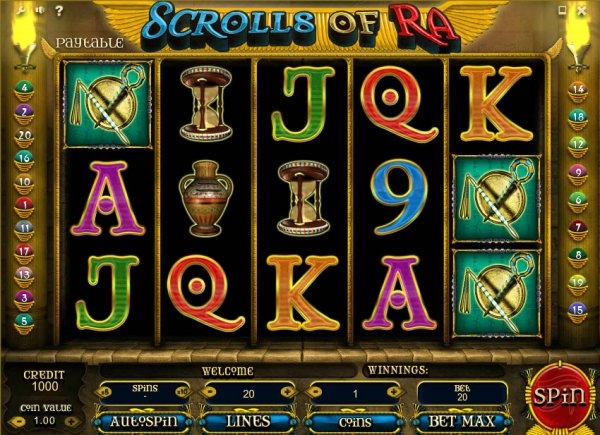 Если вы любитель Древнего Египта, то слот "Scrolls Of Ra" идеально для вас подходит. Среди символов вы наткнетесь на различные иероглифы, золотые статуэтки и даже древнеегипетские сооружения. Поэтому играя на данном слоте, у вас будет полное ощущение таинственной атмосферы, которая была свойственна тому времени. Вы не останетесь равнодушным ни к самому автомату, ни к процессу игры. Опытные игроки могут узнать в этом слоте давно завоевавший всемирную популярность игровой автомат от Gaminator - Book of Ra.
