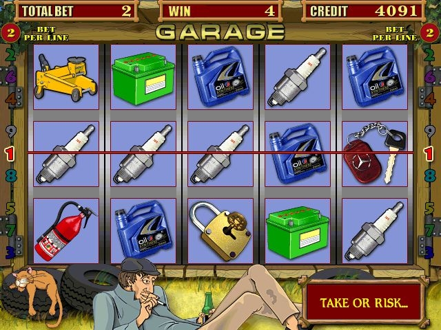 Игровой автомат Garadge содержит бонусы, которые представлены пятью ящиками, в которых находятся различные предметы и выделенный полицейским Exit, то есть Выход. Молоток, пила, ключ – накапливают по одному делению из трех. После того, как одно деление заполнено, находящаяся над ним сумма добавится к имеющимся кредитам. Отметим, что накопительные бонусы продолжают заполняться и тогда, когда один игрок покинул игру, а на его место пришел другой. Даже в ситуации, когда этот автомат свободен, он продолжает показывать, сколько же еще необходимо докачать в делениях для получения бонуса.