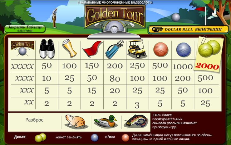Видео-слот под названием «Золотой тур» предлагает вам сыграть в популярную во всем мире игру – гольф. Если вам ранее не приходилось играть в гольф, тогда у вас отличная возможность попробовать и даже выучить парочку приемов. Прочтите описание игрового автомата Золотой тур.