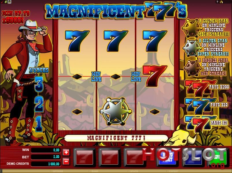 Обращаем внимание всех любителей азартных развлечений на то, что в данном увлекательном игровом автомате открыта вакансия шерифа. Должность весьма престижная и, что самое главное, отлично оплачиваемая. Любой может попробовать себя в роли шерифа одного из техасских городков, ведь игровой автомат Magnificent 777’s абсолютно бесплатный не требует предварительной регистрации для бесплатного режима игры. Как вы уже, наверное, догадались, действия будут разворачиваться на диком западе, который полон бандитов и различных опасностей. Игроку предстоит раскрывать преступления, участвовать в погоне за преступниками. Если работа шерифа будет полностью удовлетворять жителей города, тогда ему отличные премиальные обеспечены.