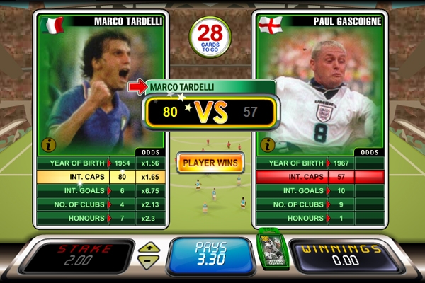 Если вы относитесь к тем игрокам, которые желают играть без прохождения регистрации, то должны опробовать игру «Top Trumps Football Legends». Данный игровой автомат запускается легко, быстро и без всяких прочих проблем. Его тематика посвящена спорту. Основными персонажами симулятора можно назвать разных знатных футболистов. На дисплее аппарата можно увидеть здоровенный стадион, на котором сидят десятки тысяч любителей и болельщиков спорта, которым не терпится увидеть начало матча. Также на этом фоне видно логотип бело-желтого цвета. Не упустите возможность опробовать бонусные игры Top Trumps Football Legends!